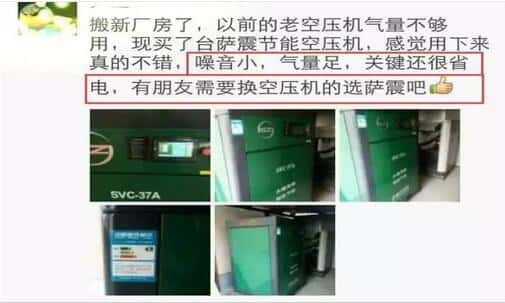該客戶用過一段時(shí)間后,是這樣說的:“搬新廠房了,以前的老空壓機(jī)氣量不夠用,現(xiàn)買了臺薩震節(jié)能空壓機(jī),感覺用下來真的不錯(cuò),噪音小,氣量足,關(guān)鍵還很省電,有朋友需要換空壓機(jī)的選薩震吧。”
