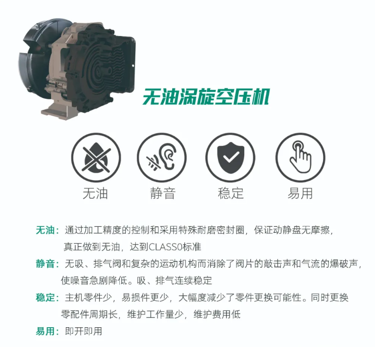 渦旋機主要是用在醫(yī)院、制藥、食品、飲料、酒廠、實驗室等一些對噪音和振動要求較高的場所,這跟渦旋機靜音、壓縮空氣無油特性有直接關(guān)系。