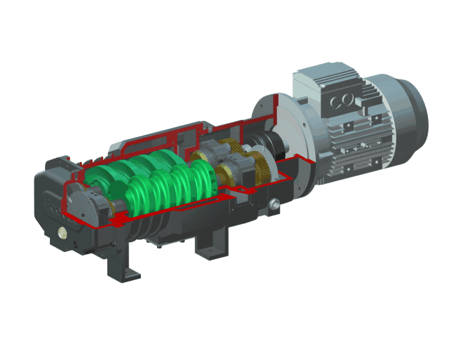 螺桿空壓機壓縮空氣是靠裝置于機殼內(nèi)互相平行嚙合的陰陽轉(zhuǎn)子的齒槽之容積變化而達到壓縮空氣的目的。(如下圖)