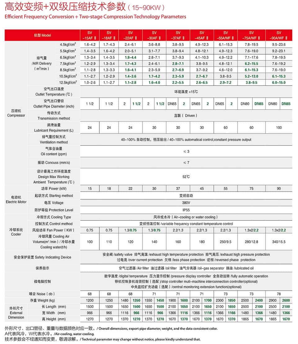 | 機型Machine Model | SVF-22A Ⅱ | SVF-30A Ⅱ | SVF-37A Ⅱ | SVF-45A Ⅱ | SVF-55A Ⅱ | SVF-75A Ⅱ | SVF-90A Ⅱ | |||